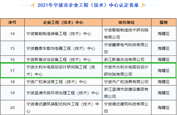 發(fā)布日期:2022.09.15 近日,寧波市發(fā)展和改革委員會(huì)、寧波市經(jīng)濟(jì)和信息化局、寧波市財(cái)政局、寧波市科學(xué)技術(shù)局聯(lián)合發(fā)文,公布2021年寧波市企業(yè)工程(技術(shù))中心認(rèn)定名單。我院為主體申報(bào)的“寧波水利水電... -
