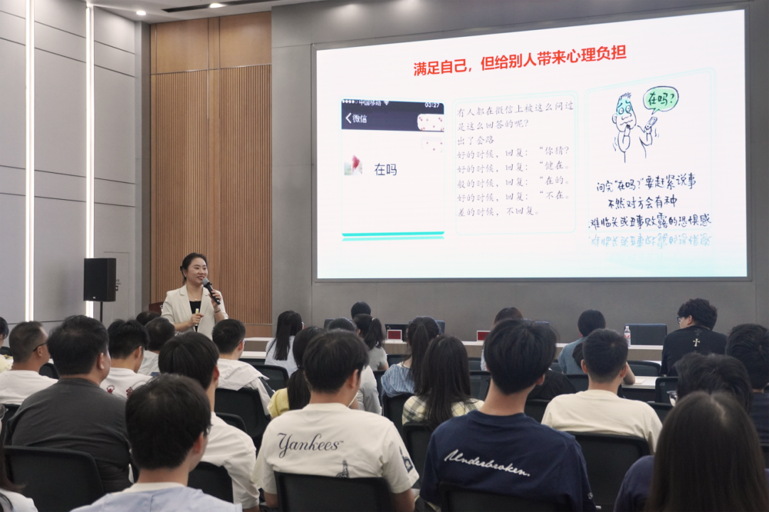 陳瑛老師的講座圍繞自我激勵、協(xié)同溝通、對外溝通、對上溝通四大維度展開。首先,陳瑛老師分別以工作場景和生活場景中的溝通對話與大家進行互動,帶領大家對“高情商”進行思考與剖析,由此展開當天的主題。隨后,結合豐富的實戰(zhàn)案例與互動環(huán)節(jié),陳瑛老師層層遞進,深入淺出地講解了如何在日常工作中實現(xiàn)高效溝通,激發(fā)自我驅動力,提升團隊協(xié)同效能。在長達2.5小時的課程中,陳瑛老師還結合商務禮儀的要點,根據(jù)不同場景對溝通實操進行了解析。并強調(diào),良好的溝通不僅是技巧,更是一種心態(tài)與習慣的培養(yǎng),也是實現(xiàn)個人與團隊實現(xiàn)共同成長的重要途徑。