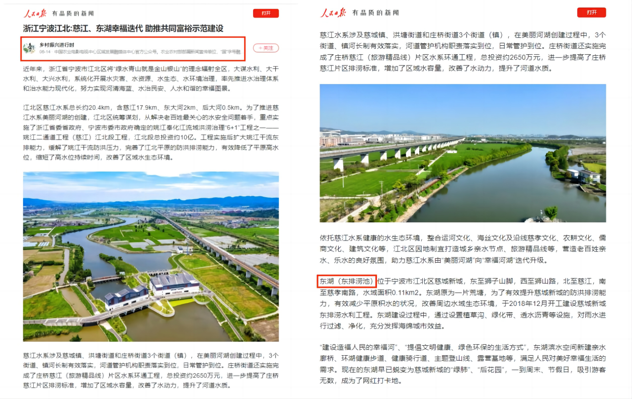 近日,由我院EPC(設計施工總承包)模式承建的慈城新城東排澇池水利工程項目,得到人民日報客戶端“鄉(xiāng)村振興進行時”的關注報道。據(jù)悉,“鄉(xiāng)村振興進行時”是中國農(nóng)業(yè)電影電視中心區(qū)域發(fā)展融媒體中心官方公眾號,農(nóng)業(yè)農(nóng)村部部屬新聞宣傳單位,“國”字號融媒體傳播機構。(原文鏈接:https://wap.peopleapp.com/article/rmh36182554/rmh36182554)